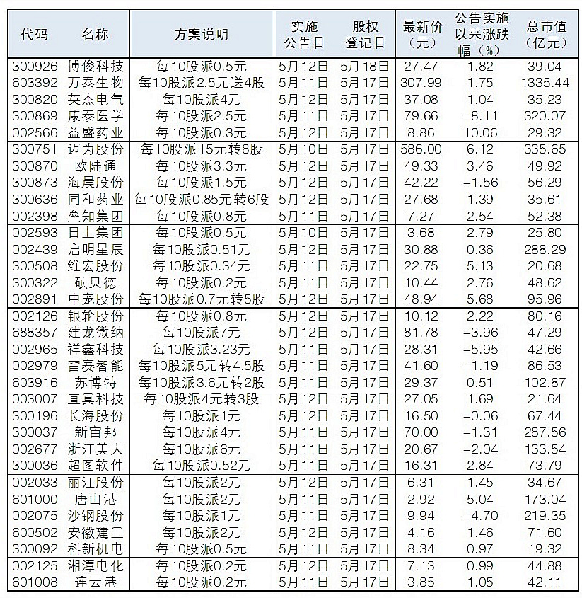 年報披露結束后,上市公司分紅陸續實施。從除權除息后個股表現看,部分個股走出填權行情,累計漲幅最高的前三名分別是電工合金、愛美客、拱東醫療。根據Wind統計,64家公司即將實施分紅計劃,其中建研院、同和藥業、中寵股份等公司計劃送轉股。