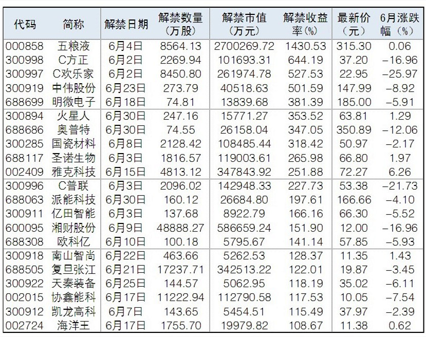 根據Wind數據統計顯示,6月共計有172家公司限售股迎來解禁。以昨日收盤價計算,42股解禁收益率超過50%。