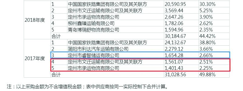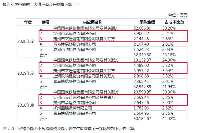 作為第三方物流企業(yè),三羊馬在向客戶提供物流服務(wù)時也需要采購鐵路運輸?shù)确?wù),例如招股書顯示中國國家鐵路集團(tuán)有限公司及其關(guān)聯(lián)方始終是報告期內(nèi)第一大供應(yīng)商,此外主要供應(yīng)商中還有兩家比較穩(wěn)定,即定州市承運物流有限公司(以下簡稱“定州承運”)、定州市文遷運輸有限公司及其關(guān)聯(lián)方 (以下簡稱“定州文遷”)。