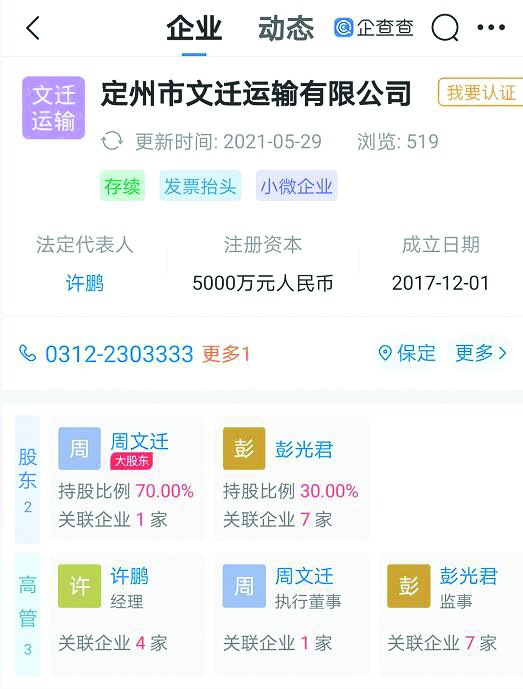 企查查顯示,定州文遷2017年12月1日成立,法定代表人許鵬,周文遷、彭光君分別持股70%、30%,許鵬任經(jīng)理、周文遷為執(zhí)行董事、彭光君為監(jiān)事(見圖三)。許鵬對外投資企業(yè)中,與運輸相關(guān)的有石家莊睿智運輸有限公司,其擔(dān)任法定代表人并持股90%,該公司成立于2017年6月20日。周文遷還持有重慶文遷物流有限公司95%以上股權(quán)并擔(dān)任法定代表人、執(zhí)行董事兼經(jīng)理,該企業(yè)成立于2017年5月26日,招股書顯示三羊馬當(dāng)時與之有尚在執(zhí)行的商品車運輸合同。