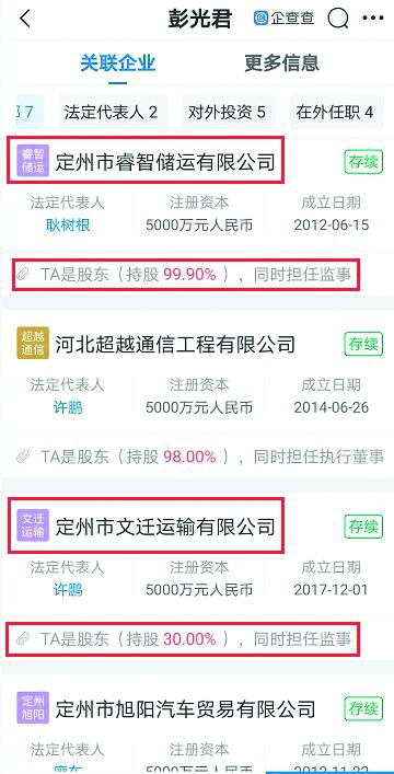 值得注意的是定州文遷持股30%的股東彭光君,其對外投資企業(yè)中,赫然有定州睿智,其持股99.90%并擔(dān)任監(jiān)事(見圖四),該企業(yè)目前仍存續(xù)。也就是說,以企查查顯示的工商登記信息來看,定州睿智與定州文遷應(yīng)當(dāng)存在關(guān)聯(lián)關(guān)系。