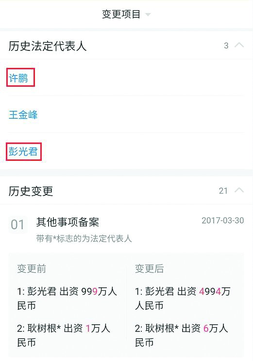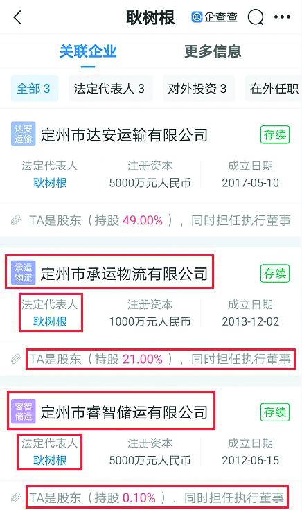 更值得注意的是,企查查信息顯示,定州睿智成立于2012年6月,法定代表人為耿樹根,其持股0.10%并擔(dān)任執(zhí)行董事(見圖五)。耿樹根還擔(dān)任三羊馬另一家大供應(yīng)商即定州承運的法定代表人,并持股21%(并列第一大股東)和擔(dān)任執(zhí)行董事(見圖六)。事實上,企查查還顯示,定州文遷的許鵬、彭光君都曾是定州睿智的法定代表人(見圖七)。