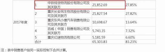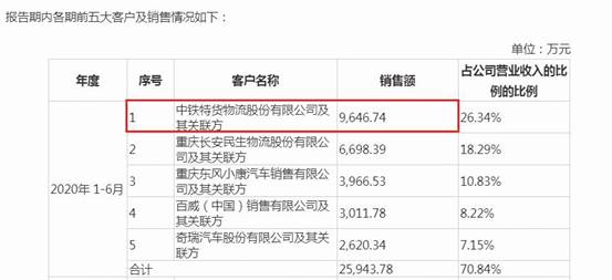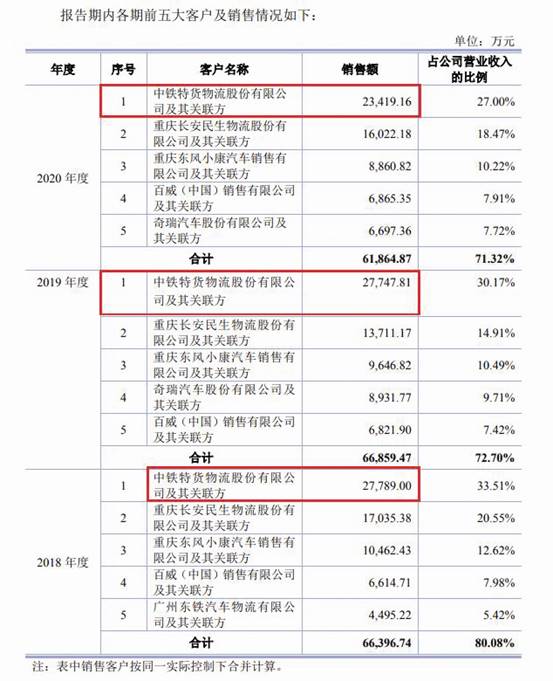 三羊馬的前五大重要客戶比較穩定,例如最新招股書顯示,中鐵特貨(即中鐵特貨物流股份有限公司)及其關聯方在報告期內始終位居公司第一大客戶,2018-2020年,公司分別向其銷售27789.00萬元、27747.81萬元、23419.16萬元,向其銷售額占公司營收比例在27%-34%區間(見圖一)。