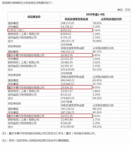 中鐵特貨同樣也在謀求主板IPO,其2020年底的最新招股書顯示,2017-2020年上半年,三羊馬(重慶中集汽車物流股份有限公司系公司前身)位列其前五大供應商,中鐵特貨向公司采購及接受勞務金額分別為20912.26萬元、29006.10萬元、26062.95萬元、8953.52萬元(見圖二)。