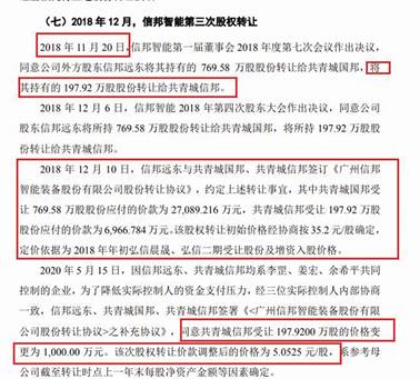 根據(jù)招股書,2018年1月15日,信邦智能第一屆董事會2018年度第一次會議作出決議,同意公司股東信邦遠東將所持312.50萬股股份以1.1億元轉(zhuǎn)讓給共青城國邦。