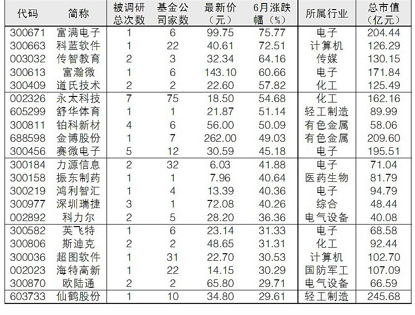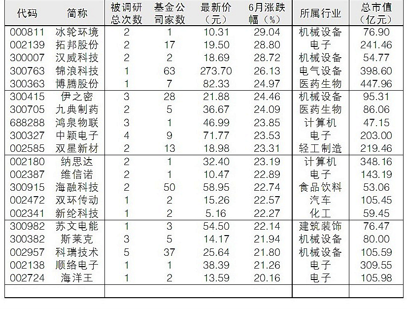 根據Wind統計,6月以來,基金公司共計調研了251家公司,這其中有41只股6月漲幅超20%。從251家公司行業分布來看,醫藥生物、機械設備、化工和電子行業頗受基金公司關注。