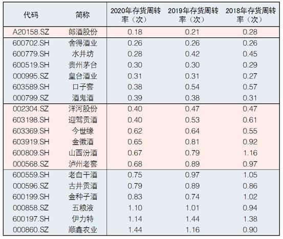 事實(shí)上,郎酒股份2018年至2020年,存貨周轉(zhuǎn)率對比A股白酒同行都處于墊底行列。2019年,18家A股白酒同行的存貨周轉(zhuǎn)率也全部高于郎酒股份,最低的舍得酒業(yè)當(dāng)時還處于披星戴帽的不利局面,存貨周轉(zhuǎn)率也有0.26次,最高的伊力特為1.44次,其中12家存貨周轉(zhuǎn)率高于0.5次。2018年,郎酒股份存貨周轉(zhuǎn)率也僅比舍得酒業(yè)和業(yè)績持續(xù)大虧的皇臺酒業(yè)稍高。