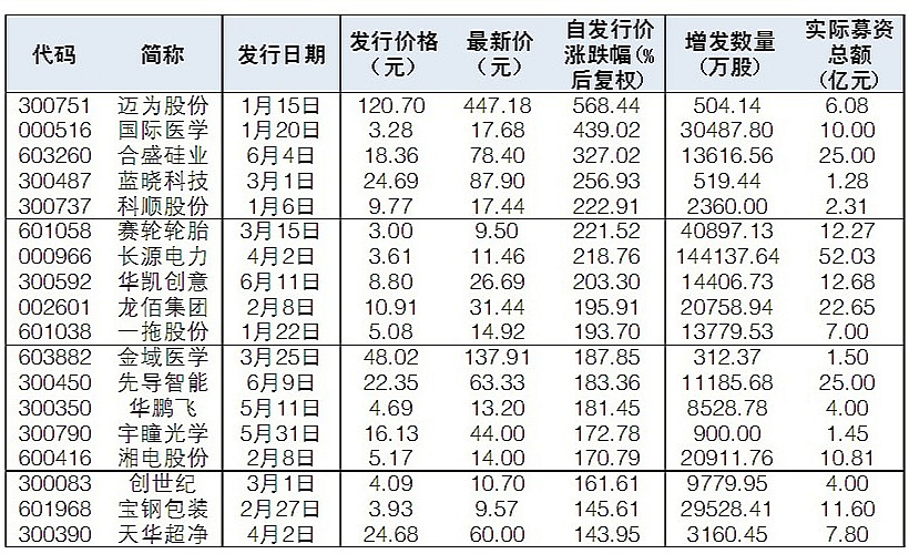 根據Wind統計,今年以來已有203家公司實施了定向增發。從二級市場來看,35股實施定向增發后股價上漲超90%,其中,邁為股份、國際醫學、合盛硅業、藍曉科技、科順股份、賽輪輪胎、長源電力、華凱創意累計漲幅超過200%。