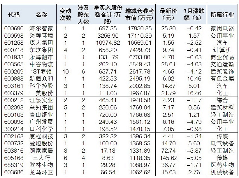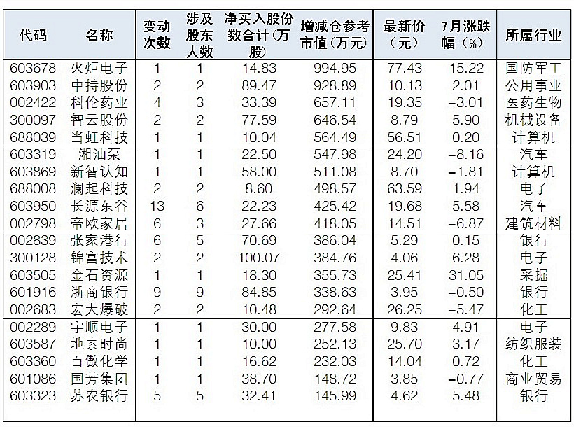 7月來41股被重要股東凈增持超百萬元