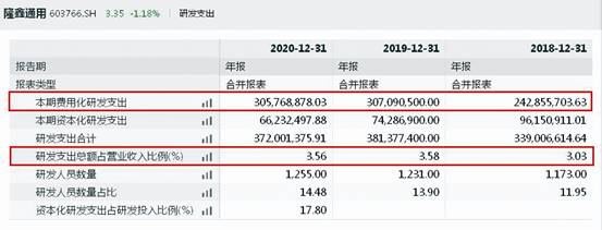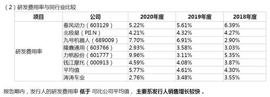 例如,濤濤車業招股書中披露隆鑫通用(603766)研發費用率2020年為2.93%,2019年為3.58%、2018年為3.03%。