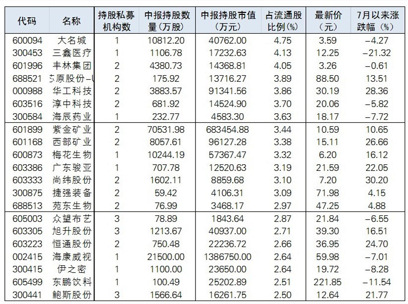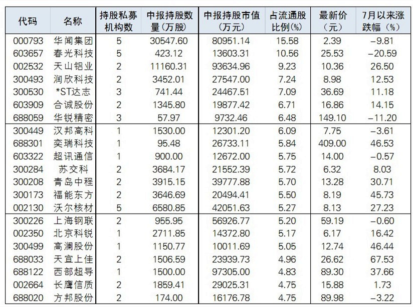 截至昨日,陽光私募二季度末出現在108家上市公司。根據Wind數據顯示,從占流通股比例來看,華聞集團、春光科技、天山鋁業、潤欣科技等排名居前。從二級市場表現來看,天宜上佳、奕瑞科技、高瀾股份、福能東方等7月以來累計漲幅超過40%。