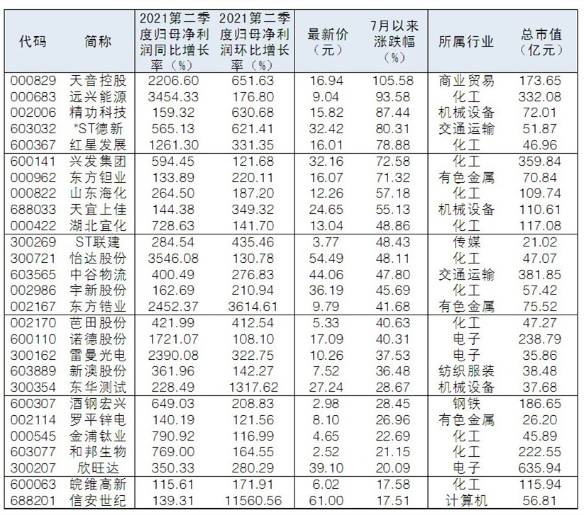 根據(jù)Wind統(tǒng)計,截至昨日,從已披露中報公司中篩選發(fā)現(xiàn)54家公司第二季度歸母凈利同比增速、環(huán)比增速均超100%。從分布來看,化工行業(yè)表現(xiàn)不俗。二級市場來看,這些雙增股中,天音控股、遠興能源、精功科技、*ST德新等7月以來漲幅超過80%。
