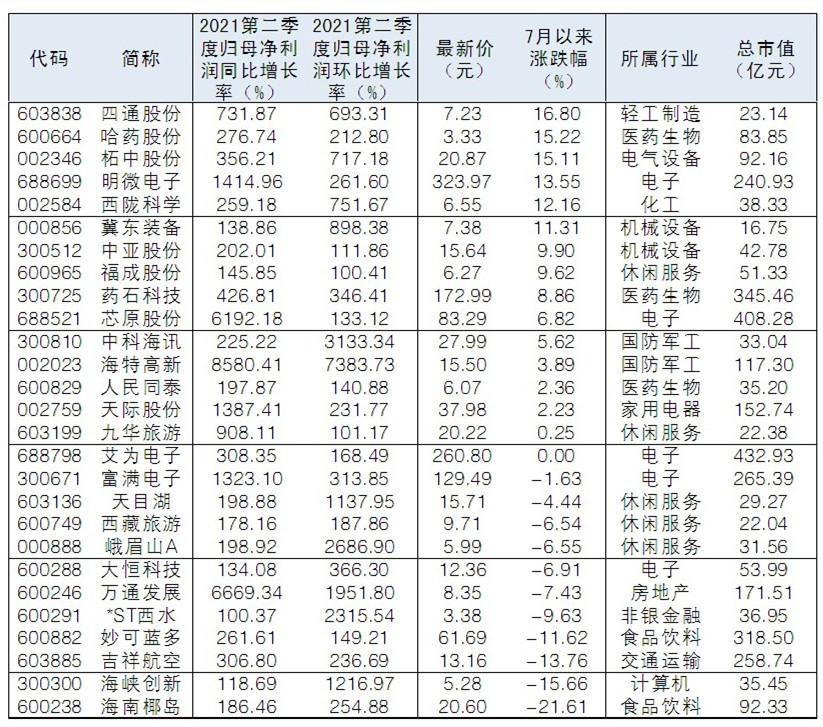 54股二季度凈利同比、環(huán)比增速均超100%