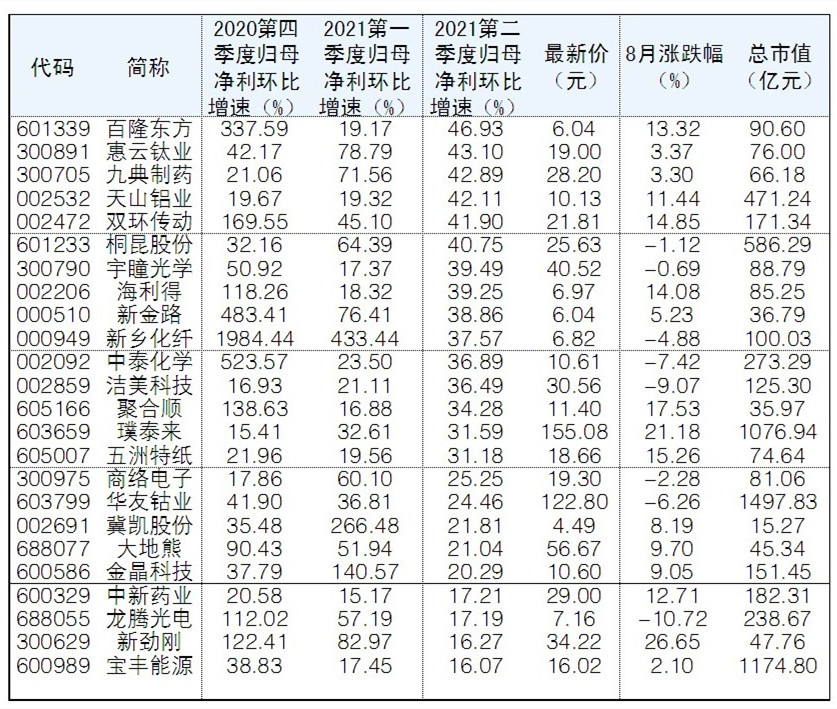 隨著中報(bào)加速披露,上市公司單季度業(yè)績逐漸清晰。根據(jù)Wind數(shù)據(jù)統(tǒng)計(jì),截至昨日,49股自去年第四季度開始連續(xù)三個(gè)季度歸母凈利環(huán)比增速均超過15%。二級市場來看,晨光新材、宇新股份8月漲幅超50%。