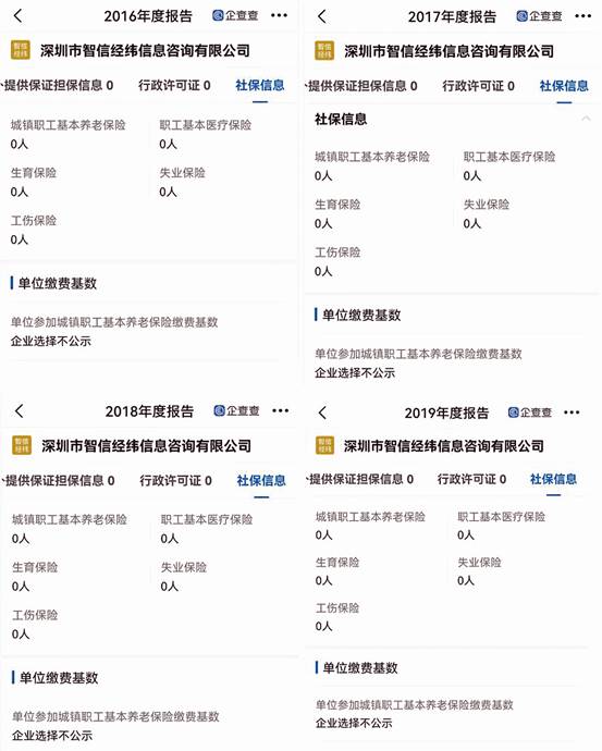 另外,企查查顯示,2019年3月12日,智信經緯的注冊資本從50萬元增加至200萬元,無對外投資記錄,也無企業官網,工商登記信息顯示企業郵箱為304866099@qq.com。智信經緯向當地市場監督機構提交的企業年報還顯示,2016-2019年,其社保參保人數均為0人(見圖二),2014-2015年則未作披露。