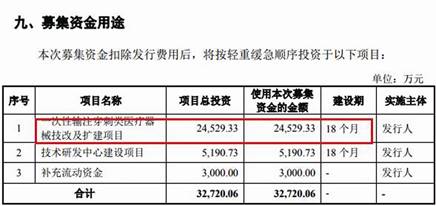 根據招股書,宏宇五洲此次擬募集資金3.27億元,投入一次性輸注穿刺類醫療器械技改及擴建、技術研發中心建設等項目以及補充流動資金等,其中一次性輸注穿刺類醫療器械技改及擴建項目可謂此次募投項目的“重頭戲”,擬投入的資金為2.45億元,約占此次擬募集資金的75%(見圖二)。