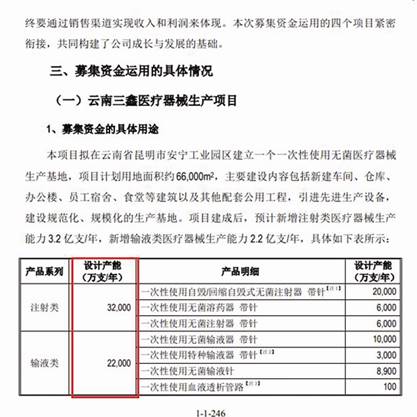 對比三鑫醫療2015年上市時的招股書,其擬募投的云南三鑫醫療器械生產項目,明確披露了注射類醫療器械設計年產能為3.2萬支/年、輸液類醫療器械設計年產能為2.2萬支/年(見圖三)。