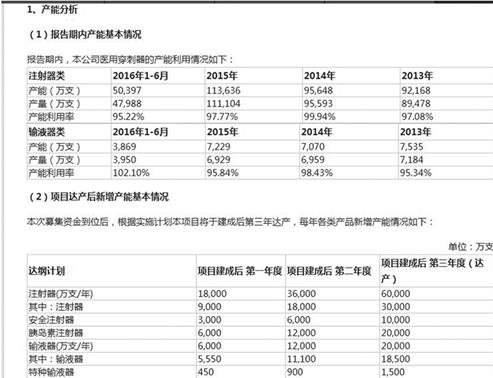 而康德萊2016年上市時的招股書,對于募投的醫用針擴建項目、醫用穿刺器生產基地改擴建項目、達產后的產能都按照不同注射器、輸液器的品類,對建成后一、二、三年后新增產能的情況進行了詳細列示(見圖四)。