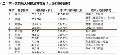 而騰信股份2014年8月上市時招股書披露,其發行前的前十大自然人股東之一季瑜,于2012年4月離職(見圖二)。也就是說,按照騰信股份招股書披露的季瑜辭職時間,比公司招股書顯示的季瑜離職時間晚10個月左右。同時,季瑜在離開騰信股份之前就創立了賓谷網絡。