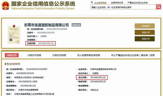 東莞寶晟存續(xù)時間的迷惑油然而生。如果按照顯示的2017年7月31日注銷時間,東莞寶晟如何“還魂”在2018年、2019年成為公司大供應商?但若以2020年10月公告簡易注銷來看,那2017年的注銷時間又從何而來?
