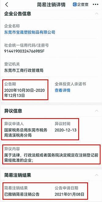 首先,東莞寶晟2020年進行簡易注銷時,國稅總局東莞市稅務局清溪稅務分局為何提出異議,后來又為何撤銷了其的簡易注銷公告?稅務機關提出異議以及撤銷簡易注銷公告,是否與東莞寶晟納稅情況相關?那么,東莞寶晟注銷時間究竟是何時,真實注銷原因又究竟是什么?