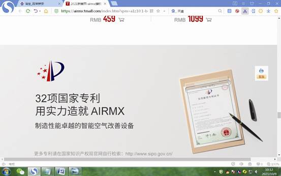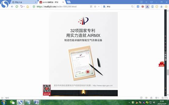 查詢顯示,北京秒新在電商平臺京東運營AirMX京東旗艦店,在天貓商城運營airmx天貓旗艦店。記者2021年10月9日登錄AirMX京東旗艦店、airmx天貓旗艦店,看到兩個旗艦店首頁中頁面都如此介紹自身產(chǎn)品的專利情況:“32項國家專利 用實力造就AIRMX 制造性能卓越的智能空氣改善設備”,頁面均配有專利證書圖樣(見圖四、圖五),也未說明專利是否為獲得授權。