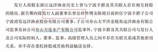 而大洋世家的原股東浙江遠洋漁業歷史上曾與寧波豐群及其關聯方存在相互持股的情況,而且大洋世家原總經理曾岳祥外甥女陳艷目前仍擔任寧波豐群子公司寧波甬發遠洋漁業股份有限公司的董事以及一家子公司和一家孫公司監事,企查查還顯示,2007年1月29日之前,曾岳祥曾為寧波豐群的法人代表。