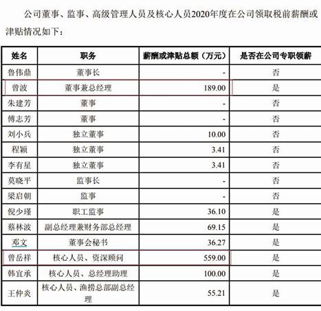 不過,先后辭去總經理、董事職務的曾岳祥目前仍然在大洋世家領薪,而且招股書披露其為公司核心人員,大洋世家在P259頁對曾岳祥的簡歷作出披露——曾岳祥,1953年10月出生,浙江舟山人,高級工程師,中共黨員,大專學歷,無境外永久居留權,曾任浙江水產學院教師,嵊泗縣水產局捕撈科科長,浙江省舟山第二海洋漁業公司總經理,舟洋漁業合營公司總經理,舟山興業有限公司總經理,舟山市政府副市長,浙江遠洋漁業總經理,寧波海神執行董事,大洋世家董事、總經理?,F任大洋世家資深顧問,同時兼任中國遠洋漁業協會副會長,浙江省遠洋漁業協會會長等社會職務,榮獲全國勞動模范,浙江省勞動模范和浙江省優秀企業家等相關稱號。