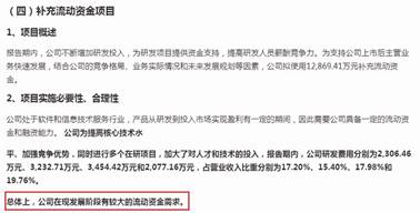 至于補流必要性、合理性,文華財經的說法是:“公司處于軟件和信息技術服務行業,產品從研發到投入市場實現盈利有一定的期間,因此需要公司具備一定的流動資金和融資能力。公司為提高核心技術水平、加強競爭優勢,同時進行多個在研項目,加大了對人才和技術的投入,報告期內,公司研發費用分別為2306.46萬元、3232.71萬元、3454.42萬元和2077.16萬元,占營業收入比重分別為17.20%、15.40%、17.98%和19.76%。”