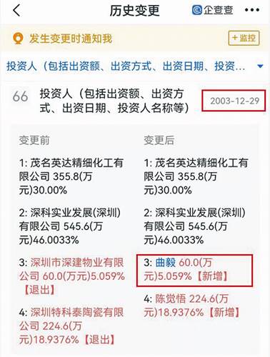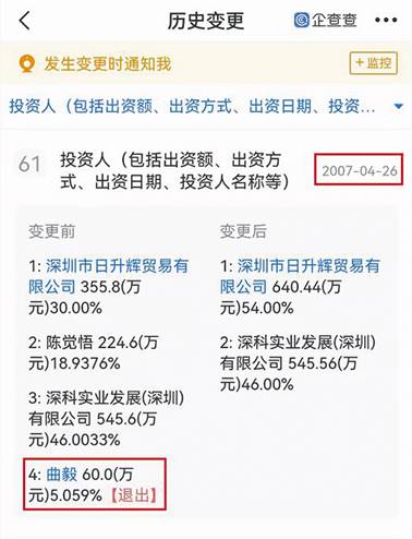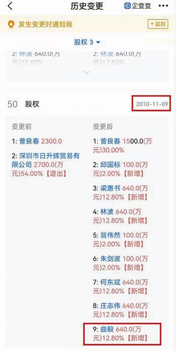 這一答案在通過企查查查詢的華輝裝飾工商變更登記信息中可以找到——2003年12月29日,華輝裝飾發生投資人變更登記,曲毅成為新股東、持股比例5.059%。到2007年4月26日,曲毅轉讓5.059%的全部股權,但透過深圳市日升輝貿易有限公司繼續間接持股(2004年4月成立、2014年4月注銷,存續期間曲毅持股20%并列第一大股東),2010年11月9日又重新直接持股12.80%(見圖二、三、四)。