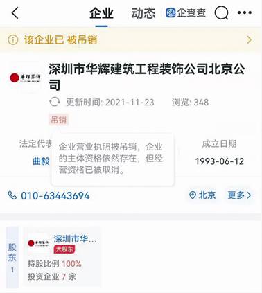 此外,企查查查詢的工商登記信息顯示,曲毅是1993年6月成立的深圳市華輝建筑工程裝飾公司北京公司(以下簡稱“華輝裝飾北京公司”)的法定代表人(見圖六),其為華輝裝飾全資子公司,不過其已被吊銷,但吊銷時間未顯示,其存續期間未發生過任何變更。