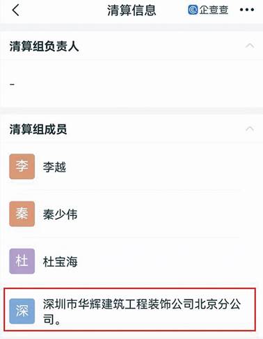 此外,時代裝飾2020年招股書曾披露,實際控制人之一的李越在報告期內還曾控制北京龍越華輝建筑裝飾材料有限公司(以下簡稱“龍越華輝”),其于2017年9月1日完成注銷登記。而企查查顯示的該企業清算信息中,清算組成員除了李越等3個自然人之外,赫然出現名為深圳市華輝建筑工程裝飾公司北京分公司的企業(見圖七)。