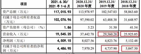 主要財(cái)務(wù)數(shù)據(jù)方面,東星醫(yī)療招股書中披露的2018年、2019年凈利潤均與新三板披露的同期年報(bào)數(shù)據(jù)存在差異。根據(jù)招股書,2018年度至2020年度及2021年上半年,東星醫(yī)療分別實(shí)現(xiàn)營業(yè)收入25925.05萬元、29560.28萬元、37442.78萬元和19545.25萬元;同期實(shí)現(xiàn)凈利潤分別為5047.50萬元、4737.90萬元、7970.29萬元和4486.95萬元(見圖一)。