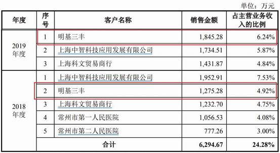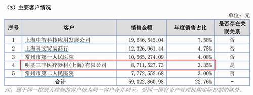 前五大客戶方面,招股書顯示,東星醫(yī)療2018年對第二大客戶明基三豐的銷售金額為1275.28萬元(見圖三),而這一數(shù)據(jù)在2018年年報(bào)中披露僅為871.15萬元(見圖四)、第四大客戶,較招股書數(shù)據(jù)少了約400萬元。此外,2019年數(shù)據(jù)同樣不一致,但招股書中,2019年東星醫(yī)療對第一大客戶明基三豐的銷售金額為1845.28萬元(見圖三),而2019年年報(bào)中為1568.24萬元和第二大客戶(見圖五)。