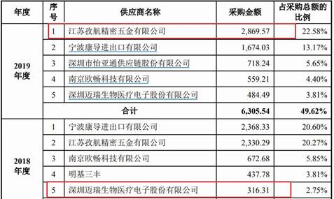 供應(yīng)商方面,公司2018年年報(bào)顯示,蘇州市聚依琦機(jī)電設(shè)備有限公司以323.33萬元的采購金額位列東星醫(yī)療第五大供應(yīng)商(見圖六),而招股書披露的2018年第五大供應(yīng)商為深圳邁瑞生物醫(yī)療電子股份有限公司,采購金額為316.31萬元(見圖七)。可見,東星醫(yī)療對深圳邁瑞生物醫(yī)療電子股份有限公司的采購金額低于對蘇州市聚依琦機(jī)電設(shè)備有限公司的采購金額,而招股書披露的2018年度第五大供應(yīng)商卻是深圳邁瑞生物醫(yī)療電子股份有限公司。