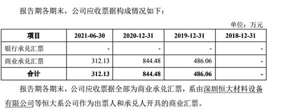 根據(jù)招股書, 2019-2021年1-6月,康力源的商業(yè)承兌匯票分別為486.06萬元、844.48萬元、312.13萬元,均系由深圳恒大材料設(shè)備有限公司等恒大系企業(yè)作為出票人和承兌人開具的商業(yè)匯票(見圖二)。