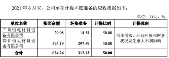 此外,截至2021年6月末,康力源進行了應(yīng)收票據(jù)單項計提壞賬準備,合計金額為312.13萬元,其中297.59萬元來自深圳恒大材料設(shè)備有限公司,而康力源對其的賬面余額為595.19萬元,此次壞賬準備的計提比例為50%(見圖三)。