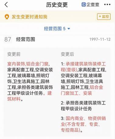 圖二:企查查關于華輝裝飾經營范圍變更截圖