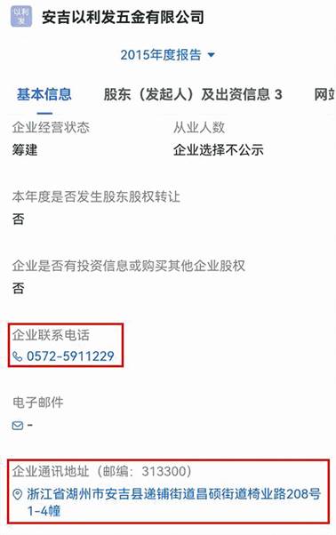 三、從企查查顯示的安吉以利發2015年企業年報看,為何使用了與公司2015年企業年報中相同的企業通訊電話?