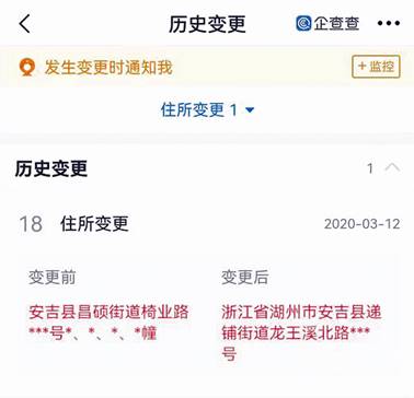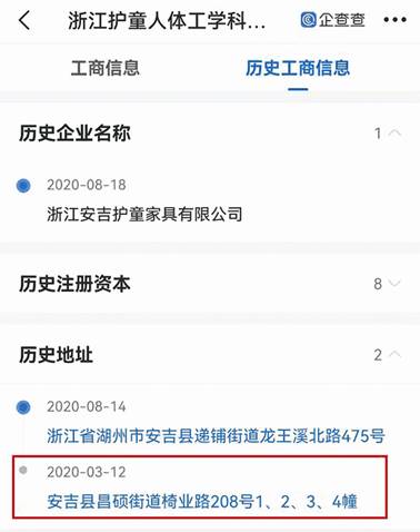 此外,工商登記信息顯示,護童科技到2020年時才發生過住所變更,地址由安吉縣昌碩街道椅業路***號*、*、*、*幢,變更為安吉縣遞鋪街道龍王溪北路***號(見圖六)。對比來看,變更前地址應當與安吉縣昌碩街道椅業路208號1、2、3、4幢對應,變更后的地址即公司招股書顯示的目前地址安吉縣遞鋪街道龍王溪北路475號。