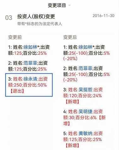 記者進一步查詢發現,安吉以利發曾有一位控股股東徐永清,企查查顯示的其2016年11月30日投資人變更信息顯示,徐永清將所持50%股權全部出讓。徐永清轉讓持股前,安吉以利發的股權結構為——徐永清持股50%,徐如林等兩位股東分別持股25%(見圖八)。