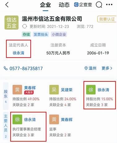 實際上,安吉以利發的曾經控股股東徐永清還有其他身份。查詢發現,徐永清還是成立于2006年1月的溫州市信達五金有限公司(以下簡稱“溫州信達”)法定代表人和持股15%股東,并任執行董事、總經理(見圖九)。企查查顯示的工商登記信息中,徐永清一直擔任溫州信達執行董事兼總經理,隨著2007年8月3日起從持股10%增至15%,還同時擔任溫州信達法定代表人。