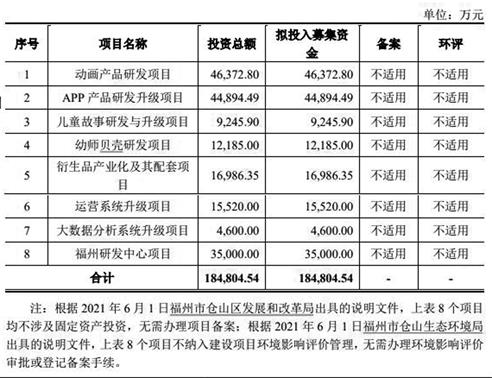 根據招股書,寶寶巴士此次擬募集資金18.48億元,投入動畫產品研發項目、APP產品研發升級項目、兒童故事研發與升級項目、幼師貝殼研發等項目的建設(見圖一)。