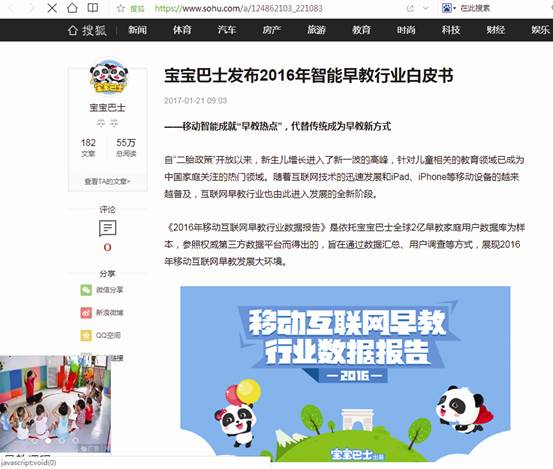 然而,雁過也會留痕。2017年之前,寶寶巴士的公開宣傳并未回避自身的互聯網早教企業身份。記者調查發現,2017年1月,包括www.chinaz.com、驅動中國等多家媒體以及名為“寶寶巴士”的搜狐號都曾登載《寶寶巴士發布2016年智能早教行業白皮書》的文章(見圖三)。