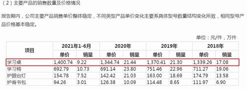 與此同時,公司學(xué)習(xí)桌的平均單價在報告期內(nèi)也存在一定波動(見圖二):2018年為1339.26元、2019年為1370.41元、2020年為1344.74元,銷量分別為17.08萬件、21.30萬件、21.44萬件;2021年上半年,平均單價、銷量分別為1400.74元、9.22萬件。完整年度看,學(xué)習(xí)桌平均單價先升后降,銷量在平均單價下降后第二年增長乏力。