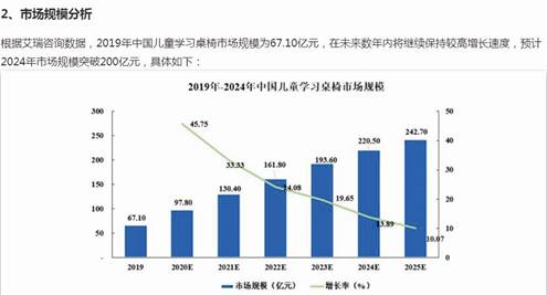更值得注意的是,公司招股書對于中國兒童桌椅市場發(fā)展,引用了艾瑞咨詢的研究數(shù)據(jù):“根據(jù)艾瑞咨詢數(shù)據(jù),2019年中國兒童學(xué)習(xí)桌椅市場規(guī)模為67.10億元,在未來數(shù)年內(nèi)將繼續(xù)保持較高增長速度,預(yù)計2024年市場規(guī)模突破200億元”。因此公司稱,“行業(yè)總規(guī)模的擴(kuò)張為公司消化新增產(chǎn)能提供有力支撐。”
