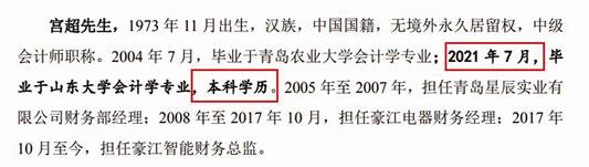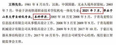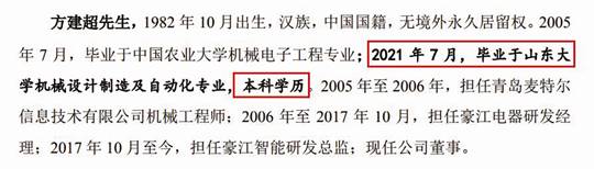 《大眾證券報(bào)》明鏡財(cái)經(jīng)工作室記者對比兩份招股書發(fā)現(xiàn),更新后的招股書中,董監(jiān)高、核心技術(shù)人員學(xué)歷水平明顯整體提高,包括公司財(cái)務(wù)總監(jiān)、監(jiān)事會主席、研發(fā)中心經(jīng)理、生產(chǎn)總監(jiān)、研發(fā)總監(jiān)在內(nèi)的多名董監(jiān)高、核心技術(shù)人員最高學(xué)歷更新至本科,且基本在2021年7月才取得。有意思的是,短短半年時間內(nèi),董監(jiān)高、核心技術(shù)人員學(xué)歷“突飛猛進(jìn)”,而對于“員工受教育程度”或“教育結(jié)構(gòu)”,豪江智能無論在更新前還是更新后的招股書中自始至終“語焉不詳”。