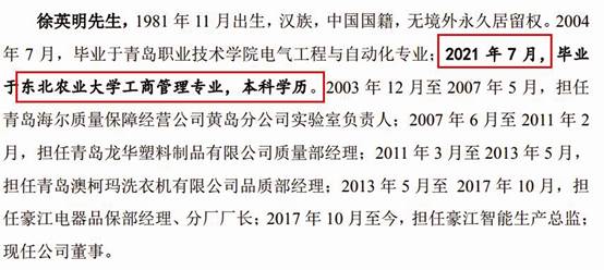 豪江智能在招股書中將方建超、王偉和田川川披露為公司核心技術(shù)人員,共3人。另外,豪江智能董事、總經(jīng)理于廷華也是在IPO前不久才獲得專科學(xué)歷。招股書顯示,1979年3月出生,漢族,中國國籍,無境外永久居留權(quán)。1998年7月,畢業(yè)于青島港灣學(xué)院機(jī)械制造專業(yè);2020年7月,畢業(yè)于東北農(nóng)業(yè)大學(xué)工商企業(yè)管理專業(yè),專科學(xué)歷。2003年至2017年10月,擔(dān)任豪江電器副總經(jīng)理;2017年7月至2020年7月?lián)魏澜悄芏隆⒏笨偨?jīng)理;2020年7月至今,擔(dān)任豪江智能董事、總經(jīng)理。