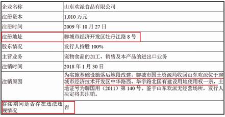 對于注銷原因,乖寶寵物在招股書中稱:“實施基礎設施落后地段改建,聊城市國土資源局收回山東歡派位于聊城市經濟技術開發區中華路西、華宇路北國有建設用地使用權一宗,土地證號為聊國用(2011)第140號。鑒于山東歡派食品有限公司無經營場所,發行人決定將其注銷。”并表示存續期間不存在違法違規情況(見圖一)。