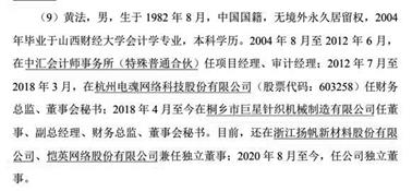 招股書同時披露的新當選獨董黃法簡歷顯示:其于2004年畢業于山西財經大學會計學專業,本科學歷。2004年8月至2012年6月,在中匯會計師事務所(特殊普通合伙)任項目經理、審計經理;2012年7月至2018年3月,在杭州電魂網絡科技股份有限公司(股票代碼:603258)任財務總監、董事會秘書;2018年4月至今在桐鄉市巨星針織機械制造有限公司任董事、副總經理、財務總監、董事會秘書。目前,還在浙江揚帆新材料股份有限公司、愷英網絡股份有限公司兼任獨立董事;2020年8月至今,任公司獨立董事(見圖一)。
